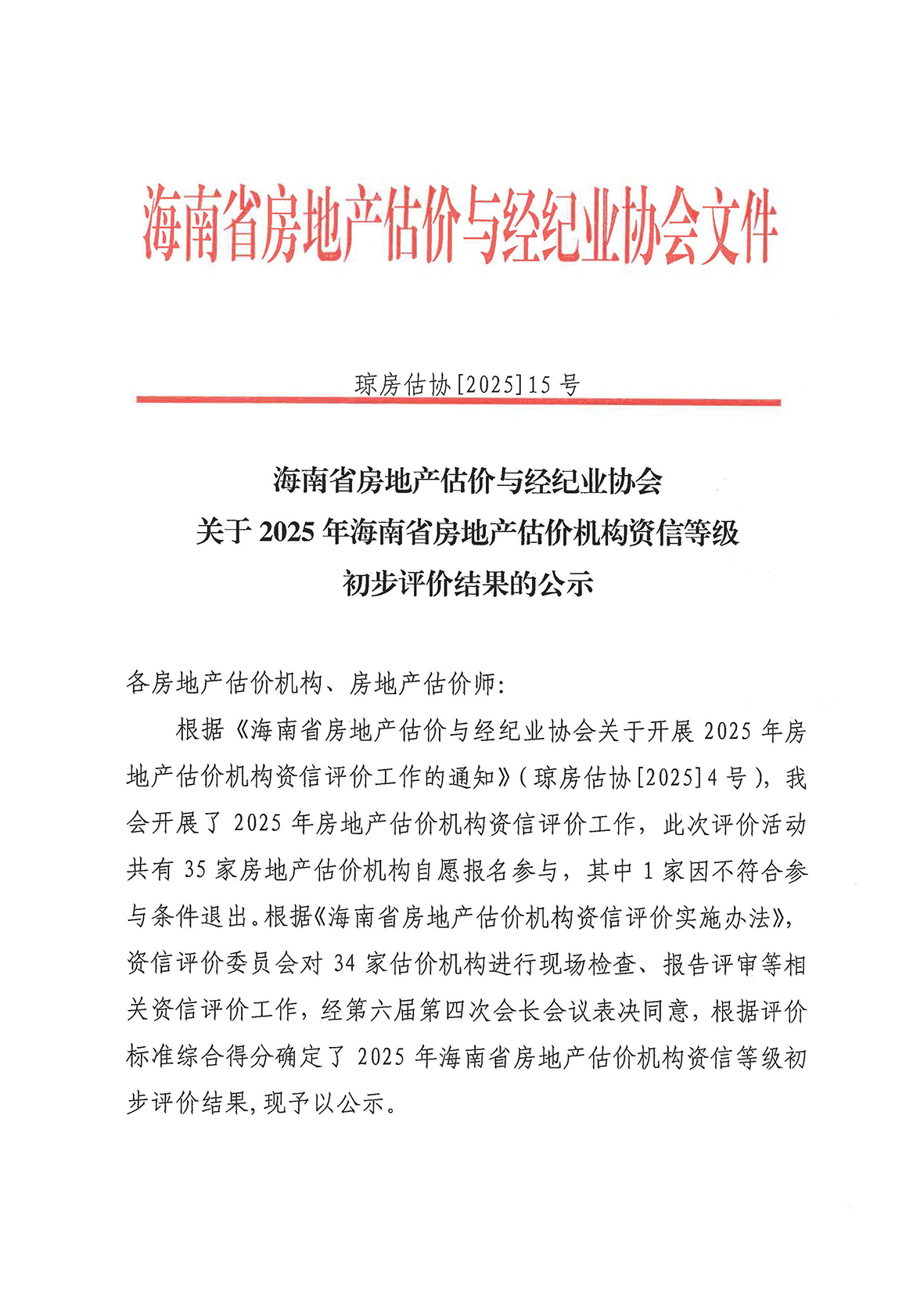 关于2025年海南省房地产估价机构资信等级初步评价结果的公示
